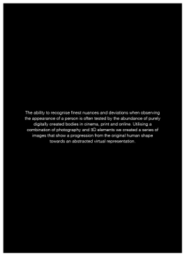 The ability to recognize the finest nuances and deviations when observing the appearance of a person is often tested by the abundance of purely digitally created bodies in cinema, print, and online. Utilizing a combination of photography and 3D elements we created a series of images that show a progression from the original human shape towards an abstracted virtual representation.